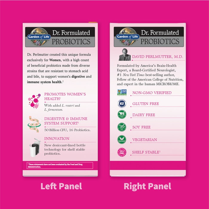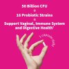 Ingredients: Women’s Daily Probiotic Blend (Bifidobacterium bifidum, Lactobacillus brevis, Bifidobacterium infantis, Lactobacillus salivarius, Lactobacillus acidophilus, Lactobacillus gasseri, Lactobacillus casei, Bifidobacterium lactis, Lactobacillus bulgaricus, Bifidobacterium breve, Lactobacillus reuteri, Bifidobacterium longum, Lactobacillus fermentum, Lactobacillus Plantarum, Lactobacillus Rhamnosus, Lactobacillus paracasei), Total Lacto Cultures (40 Billion CFU), Total Bifido Cultures (10 Billion CFU), Total Probiotic Cultures 50 Billion CFU, Prebiotic Fiber Blend (Acacia Fiber (A. sengal), Potato [Resistant Starch] (tuber))